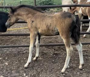 Comferts Night Stalker 4-22-23, ASPC black sabino GELDING sired by TSL's Ravens Nighthawk x Pattis Minnie Lexus. This colt is a full brother to last years Reserve Champion Classic foal of current year!